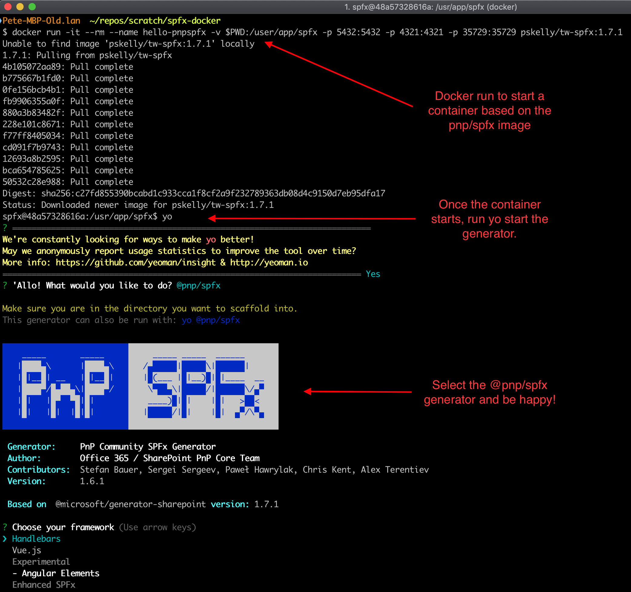 docker run -it --rm --name hello-spfx -v $PWD:/usr/app/spfx -p 5432:5432 -p 4321:4321 -p 35729:35729 pskelly/tw-spfx:1.7.1