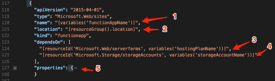 [resourceGroup().location]property. - The Function App depends on a hosting plan from the App Service resource which uses a template function to get the specific resource ID of the AppService Plan as the dependency.