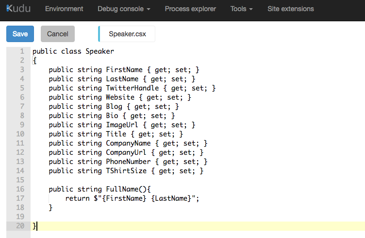 Finally, the Speaker.csx file that has the properties and methods we want shared across our functions is very simple for this example, but there is real power here. For example, our class that is responsible for Tweets might be a shared class that we can consume across multiple functions. Below is a screen shot of the Speaker class being edited in the Kudu console.