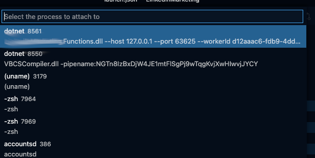 Once the process is running, I can attach to the process using the following configuration in launch.json from Visual Studio Code.