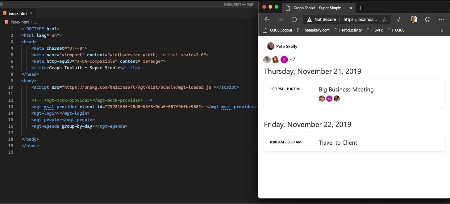 One thing to notice is the <mgt-mock-provider></mgt-mock-provider> above which is commented out. This can get you started with disovering, styling and themeing the components for your use. Very handy feature!