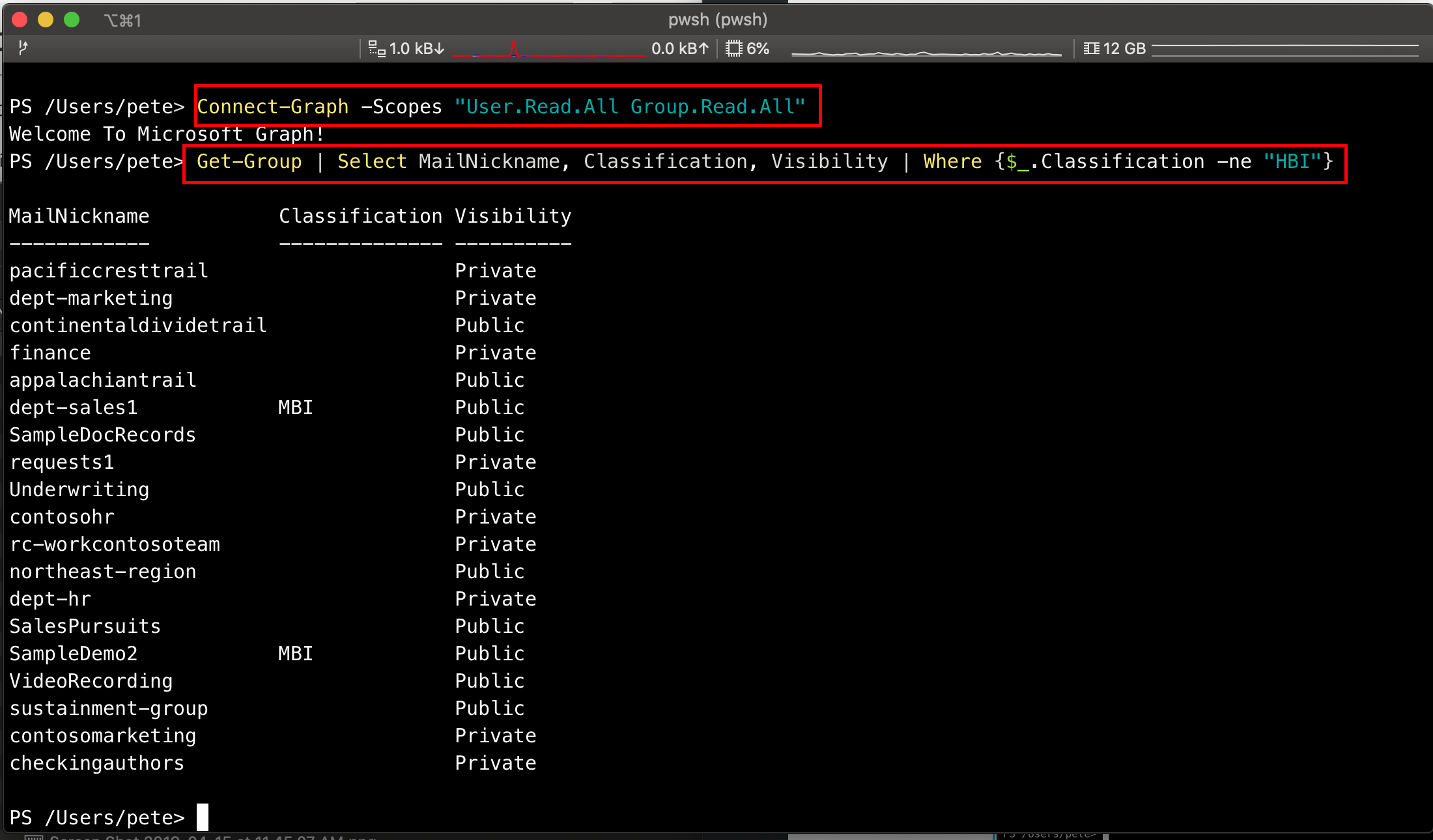 The session demonstrated the usage of the cmdlets, which is dead simple, and provided a view into the new cross platform, PowerShell cmdlets. A simple Connect-Graph call with the scopes needed and you are ready to start executing commands. The example below simply lists Office 365 Groups where the group Classification is not "HBI". This set of cmdlets should make developers and administrators alike very happy!