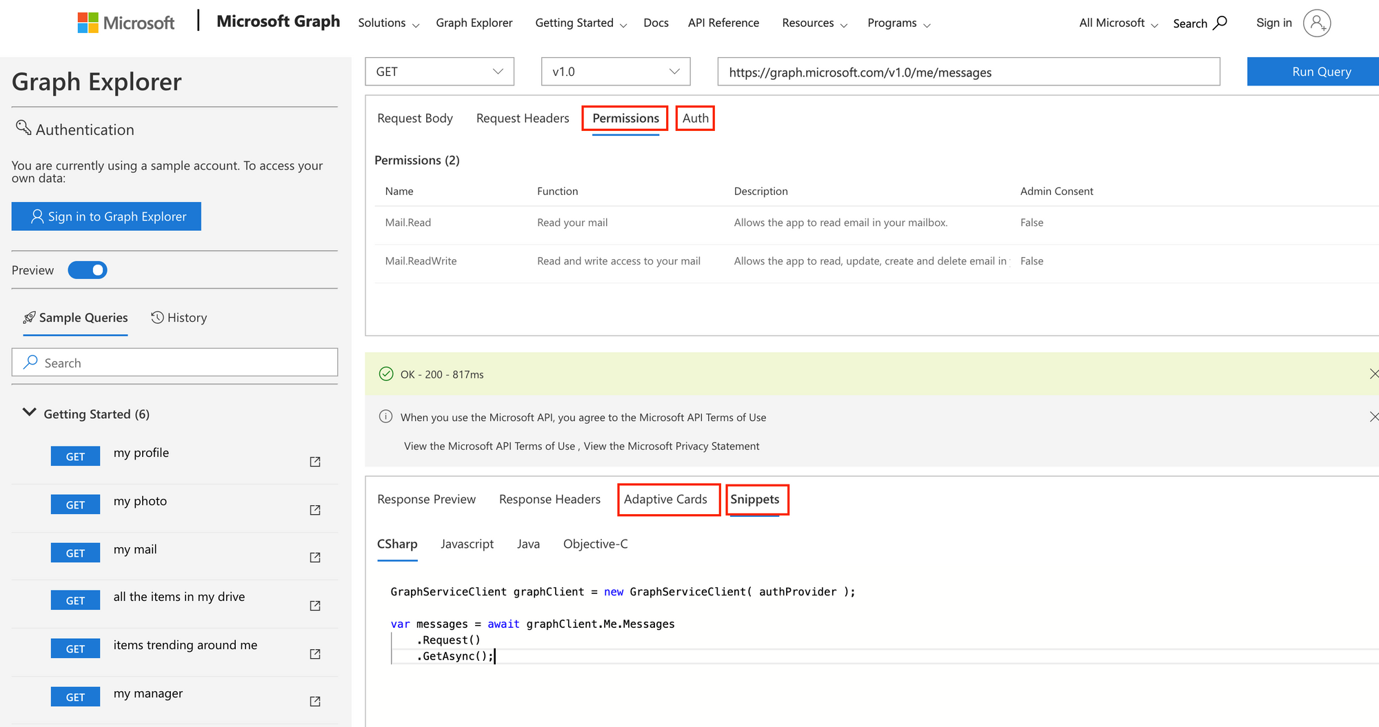 Not necessarily new for Ignite, but definitely something worth knowing about. The new Graph Explorer. The best part of the new experience is the additional information. Queries now return access tokens which you can use for other queries and to troubleshoot access or scopes issues, multiple code snippet samples in C#, JavaScript, Java, Objective-C, and I hear support for PowerShell is being considered. One additional tab that piqued my interest was the Adaptive Cards tab. While this tab gives a great view into the display of the data, there is no json information at this point, hopefully this is in the works.