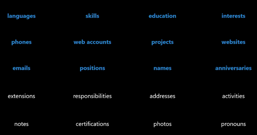 Things like languages and language proficiency, interests, skills, anniversaries, projects and education are available in the preview today (in blue), with the items like addresses, activities, photos and more (in white) coming soon. Be sure to test the preview out and provide feedback for things you think should be added!